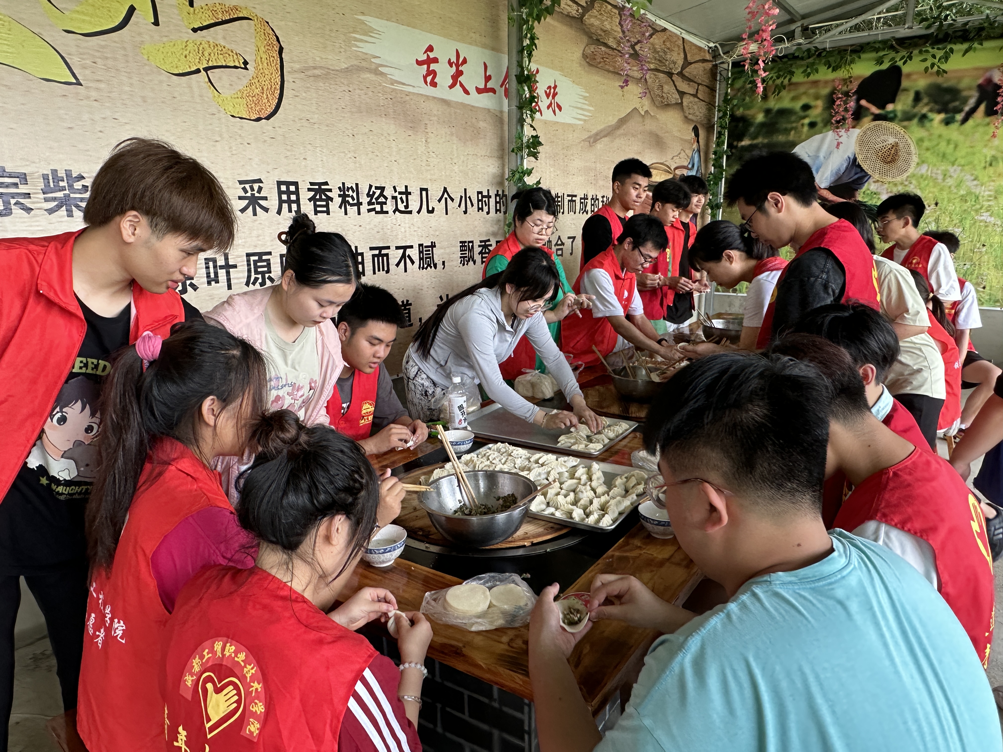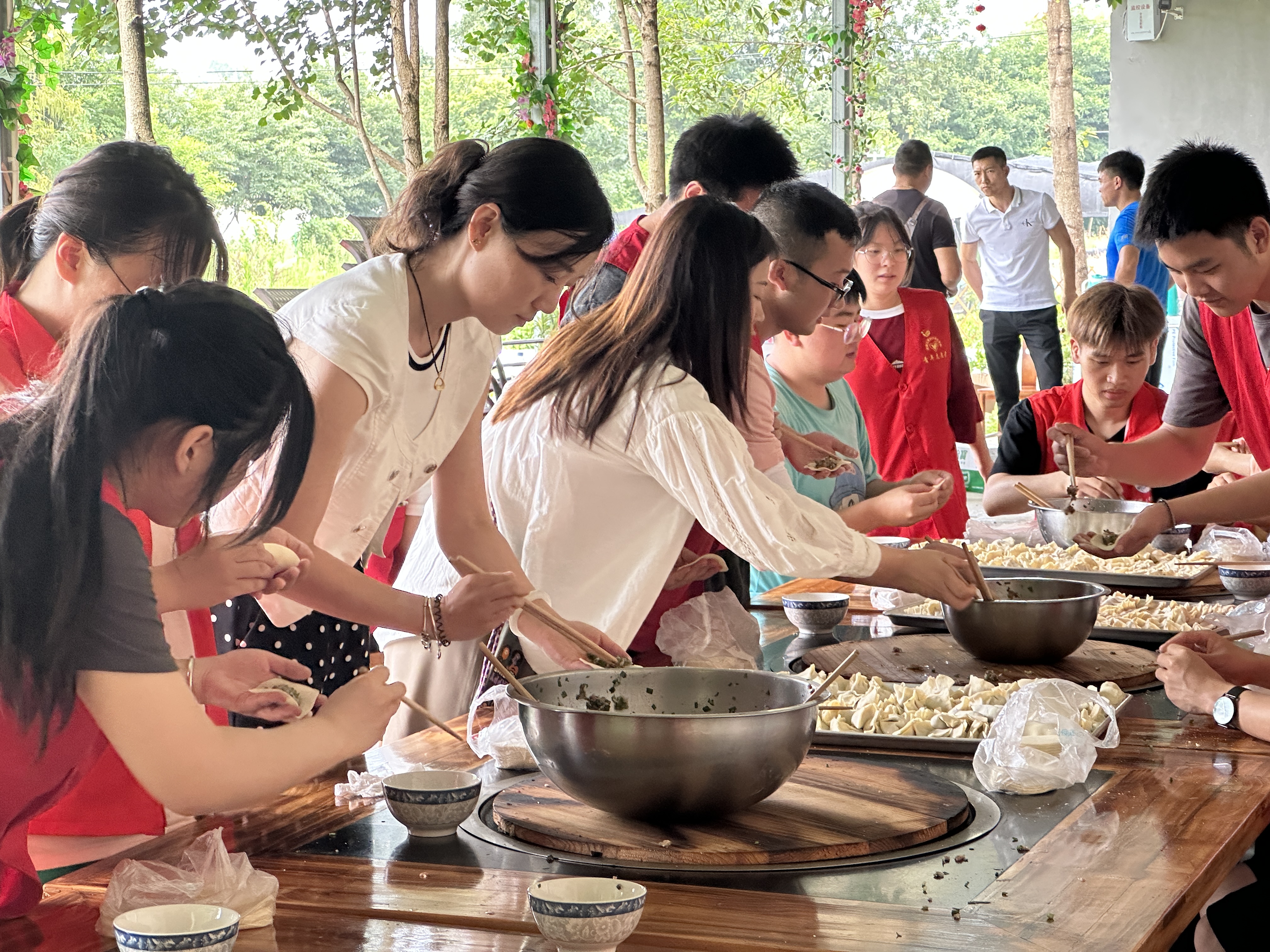 志愿者们走进乡下在当地居民的带领下深入田间地头亲自动手为农作物拔草松土,了解它们的生长状态与环境,对地上散落的枝干进行收纳整理。中午期间,我们进行了包饺子活动,活动现场,老师先进行了现场指导,老师一边慢慢演示,一边讲解步骤要领,同学们细心观看,认真学习包饺子的技术要领,相互切磋包饺子的技巧。